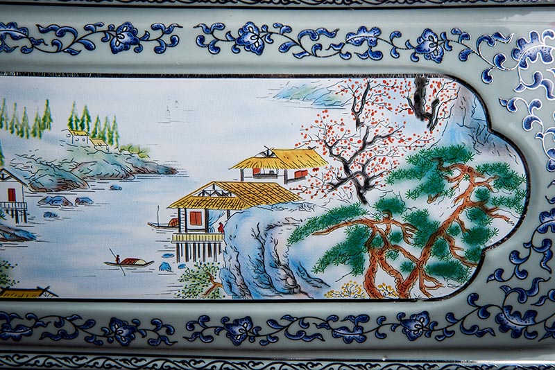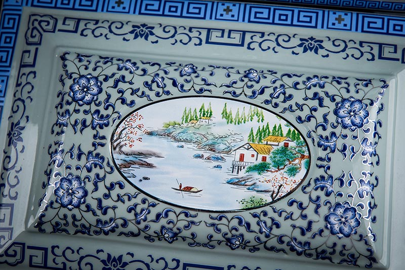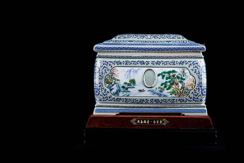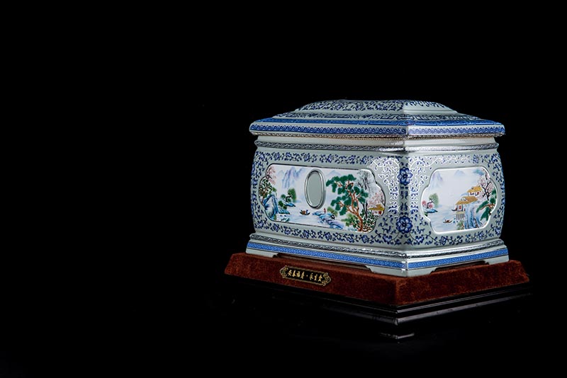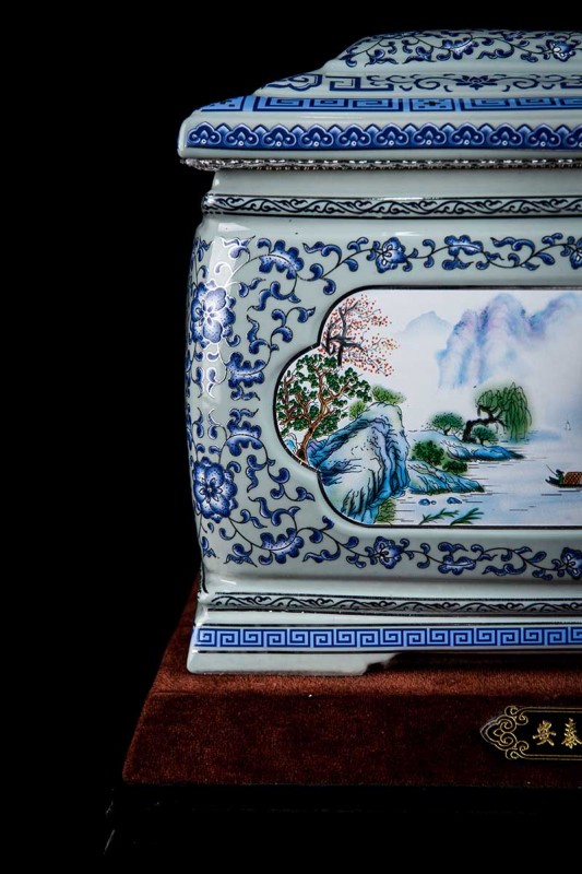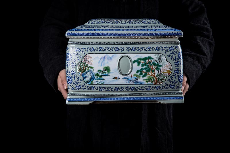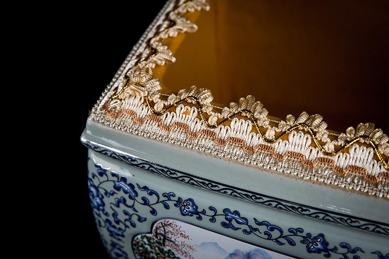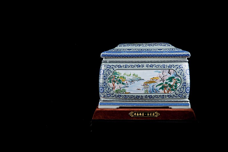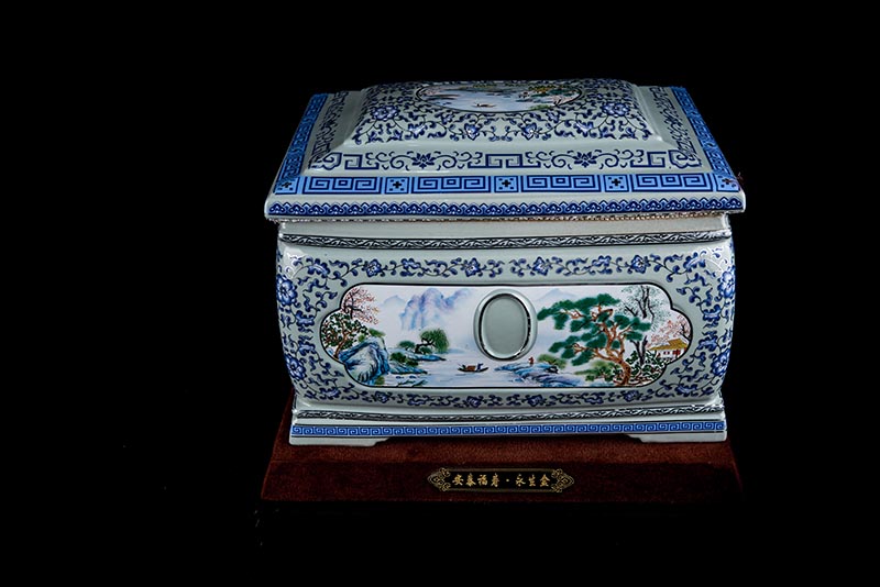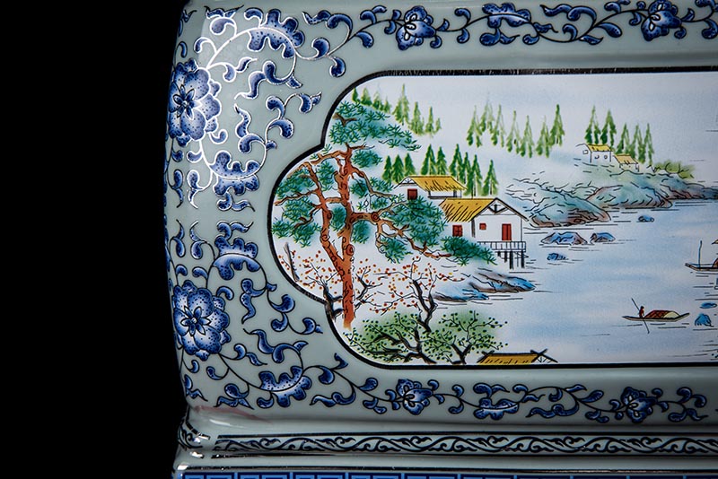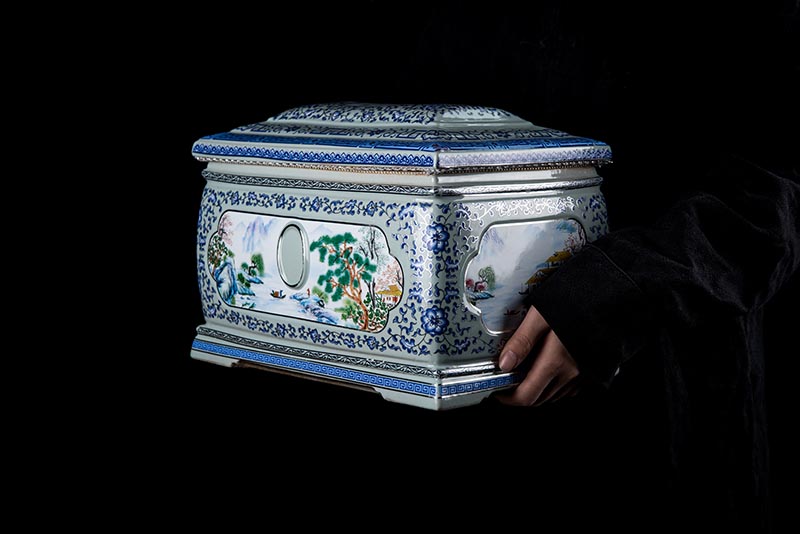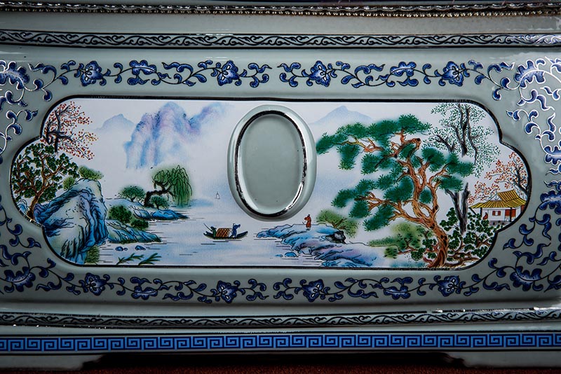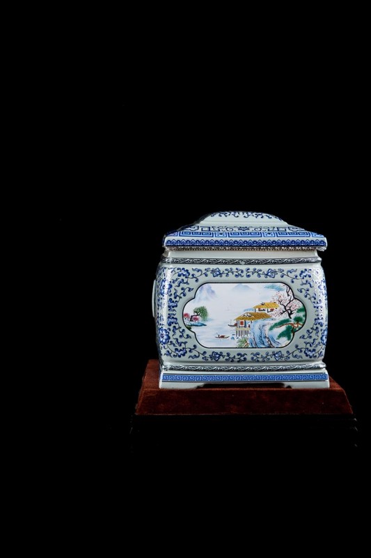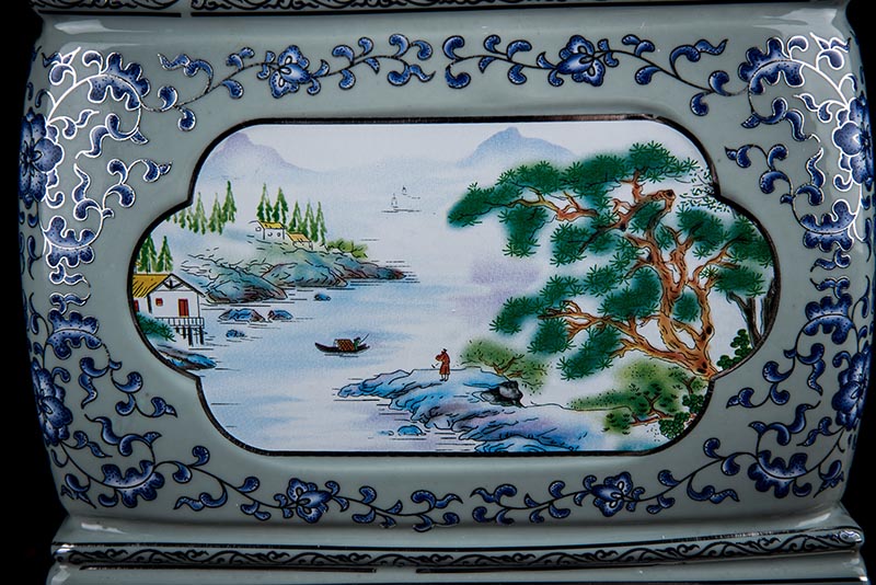 這款產(chǎn)品采用了青花粉彩工藝,既有景德鎮(zhèn)具特色的青花,又有山水,景德鎮(zhèn)民間稱之為“開窗山水”很多工藝品都會運(yùn)用上,讓許多文人墨客忍不住注目觀看。我們可以看到這款產(chǎn)品圖片上青花與山水搭配巧妙,纏枝蓮紋環(huán)環(huán)相扣,寓意后世枝繁葉茂,代代繁榮。尺寸:340x230x250mm